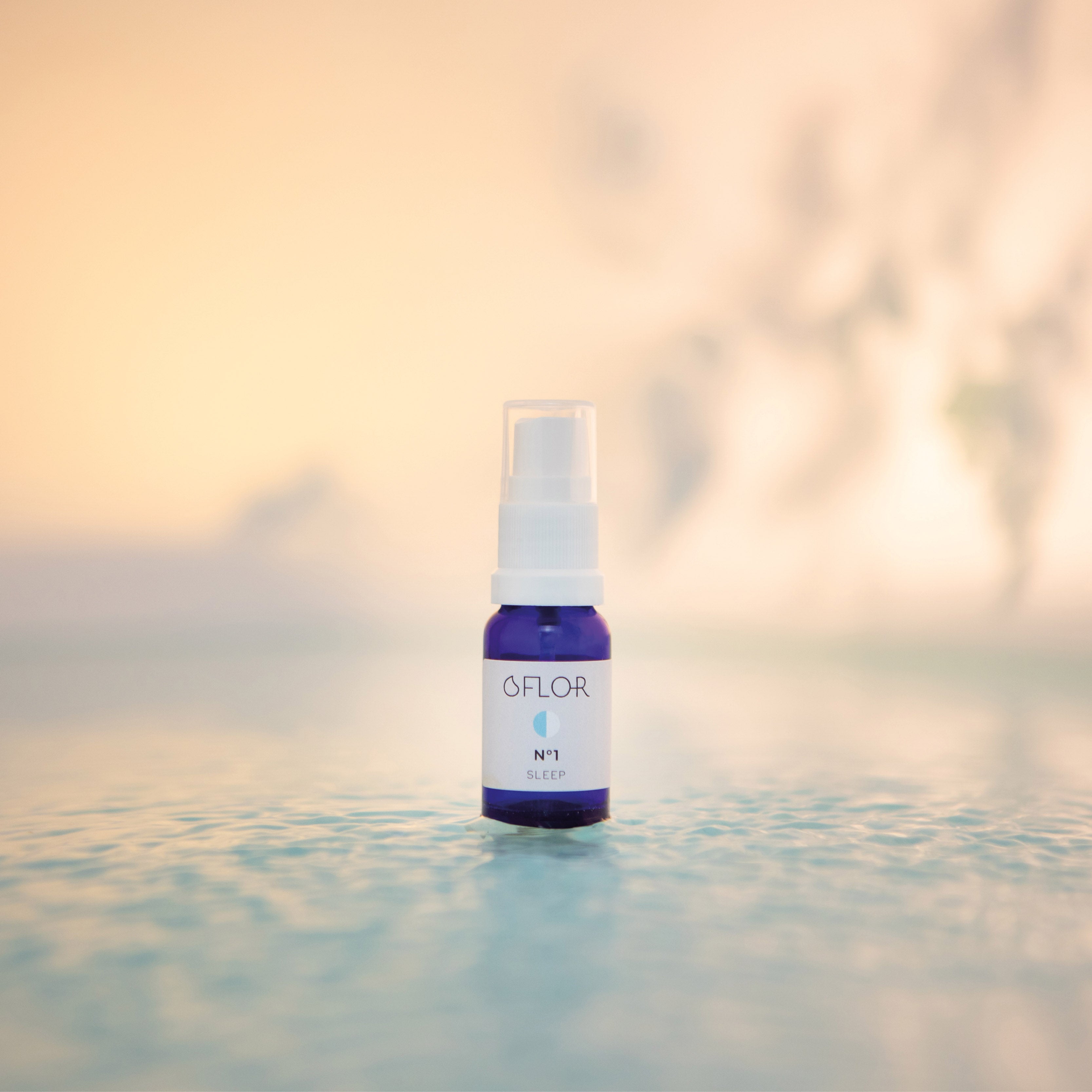 Composé d'hydrolats bi-distillés de ravintsara, mandarine, camomille, valériane dans un flacon en verre bleu.
